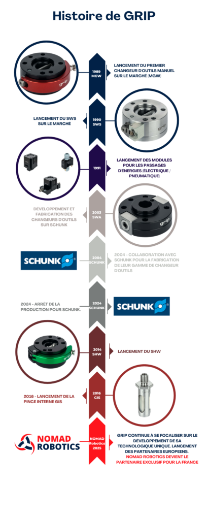 Depuis plus de 30 ans, GRIP développe des solutions de changeurs d’outils (connecteurs) reconnus pour leur fiabilité et leur robustesse dans des environnements industriels exigeants.